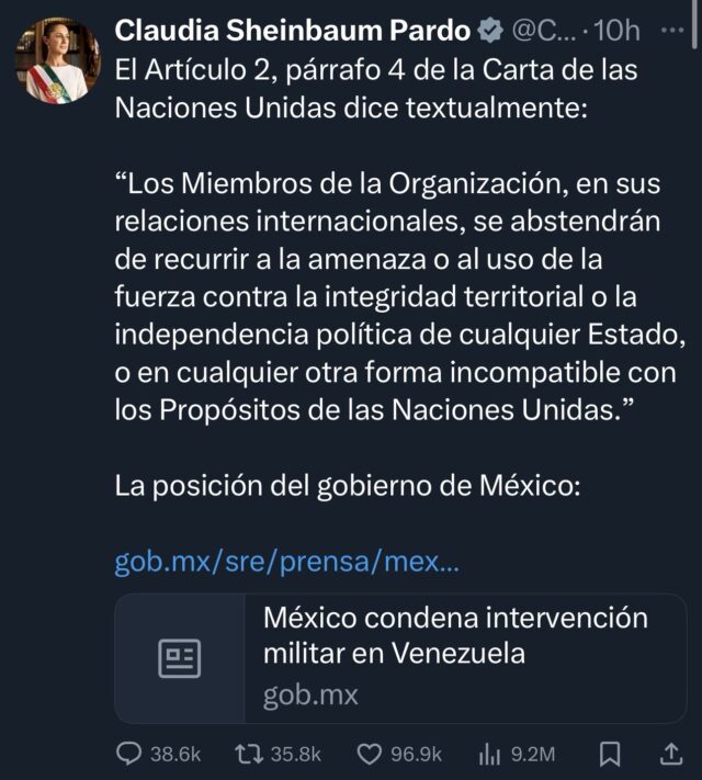 La mandataria acompañó su mensaje con un enlace a un comunicado oficial del gobierno federal, en el que México expresa su condena a cualquier forma de intervención militar en Venezuela y reitera su llamado al respeto de la soberanía de los pueblos.
