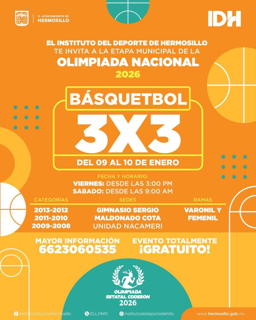 El Instituto del Deporte de Hermosillo (IDH) invita a niñas, niños y jóvenes a participar en la etapa municipal de Básquetbol 3×3, como parte del proceso rumbo a la Olimpiada Nacional 2026, evento que se llevará a cabo los días viernes 9 y sábado 10 de enero.