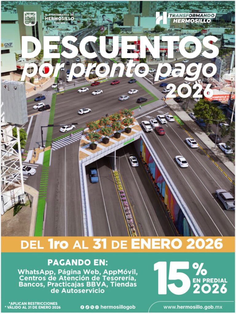 El Gobierno Municipal pone a disposición diversas opciones de consulta y pago, entre ellas WhatsApp al (662) 347 4870, la página web www.hermosillo.gob.mx, la App Móvil HermosilloGob, así como los 13 centros de atención de Tesorería, bancos, practicajas BBVA y tiendas de autoservicio.