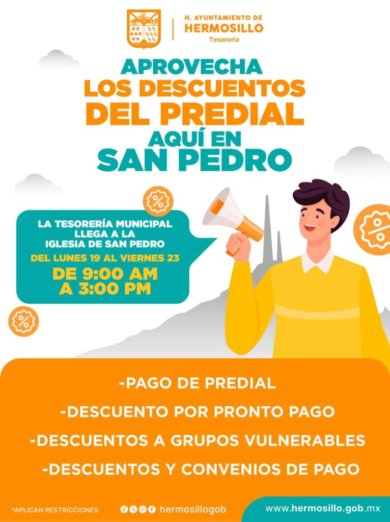 A partir de este lunes 19 de enero y hasta el viernes 23 operará un Centro de Atención de Tesorería Municipal de Hermosillo en la iglesia de San Pedro el Saucito, informó Yazmina Anaya, directora de Ingresos de la dependencia.