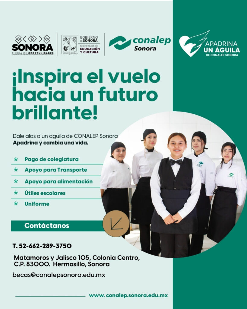 Con el firme compromiso de fortalecer la educación media superior y promover el bienestar estudiantil, el Colegio de Educación Profesional Técnica del Estado de Sonora (Conalep Sonora) refuerza la campaña permanente de becas “Apadrina un Águila”, respaldada por el Gobierno de Sonora y los programas impulsados por el gobernador Alfonso Durazo.
