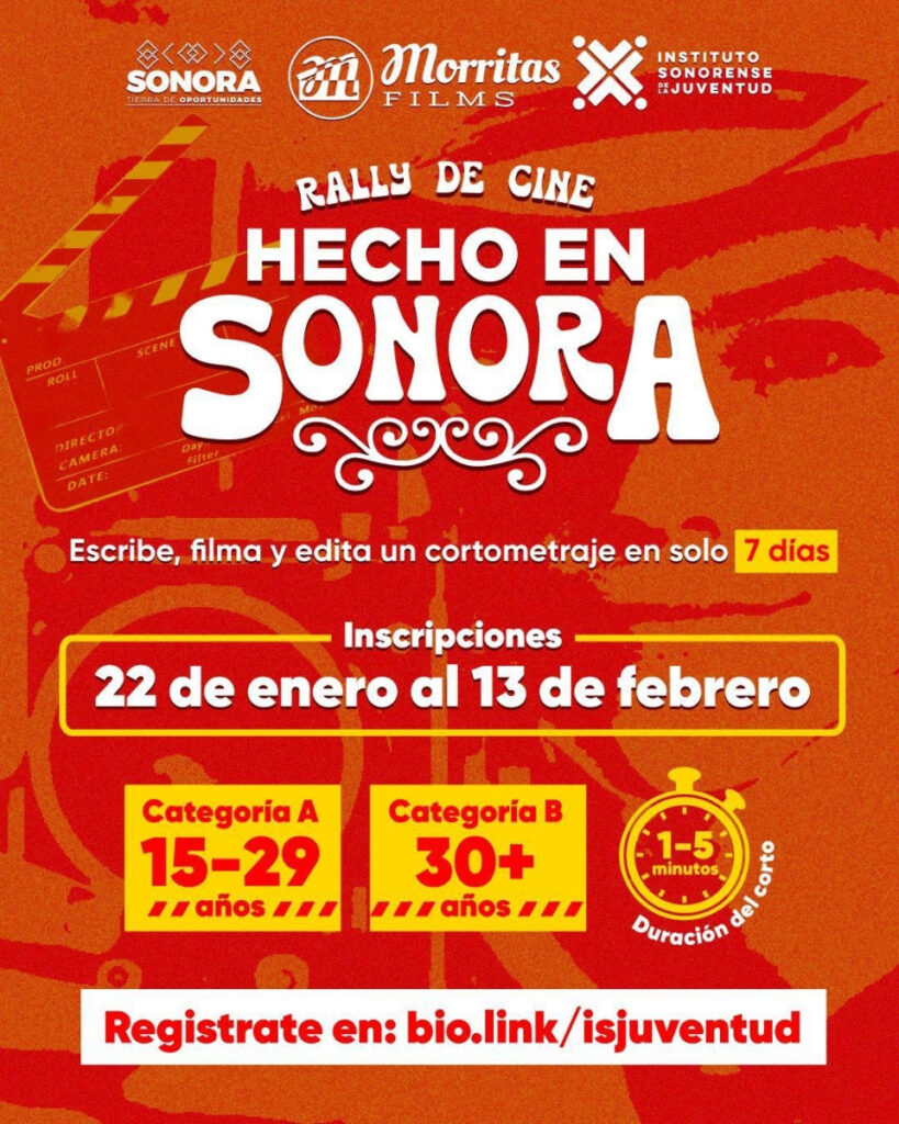 El Gobierno de Sonora, a través del Instituto Sonorense de la Juventud (ISJ) y en colaboración con la colectiva fílmica Morritas Films, lanzó la convocatoria para la primera edición del rally de cine Hecho en Sonora “1 semana, 1 cortometraje”, que se llevará a cabo del 22 de enero al 5 de marzo de 2026.