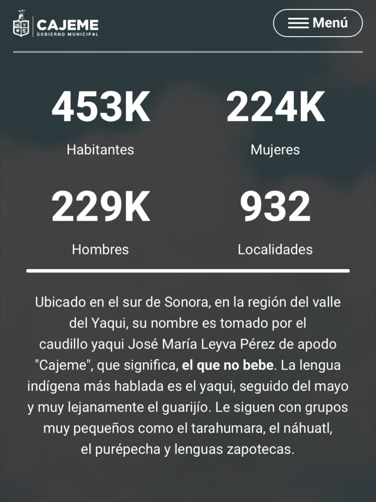 De acuerdo con el portal oficial del Gobierno Municipal de Cajeme (cajeme.gob.mx), el municipio cuenta con 453 mil habitantes, cifra que es presentada como parte de los datos generales del territorio y que es utilizada como referencia institucional por la administración local.