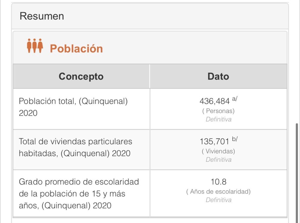 La diferencia entre ambas cifras es de aproximadamente 16,500 habitantes, lo que representa una variación cercana al 3.7% respecto al dato censal del INEGI. Este contraste puede explicarse por el uso de estimaciones municipales actualizadas frente a datos censales quinquenales, aunque no se precisa en el sitio municipal el método técnico utilizado para llegar a la cifra de 453 mil habitantes.