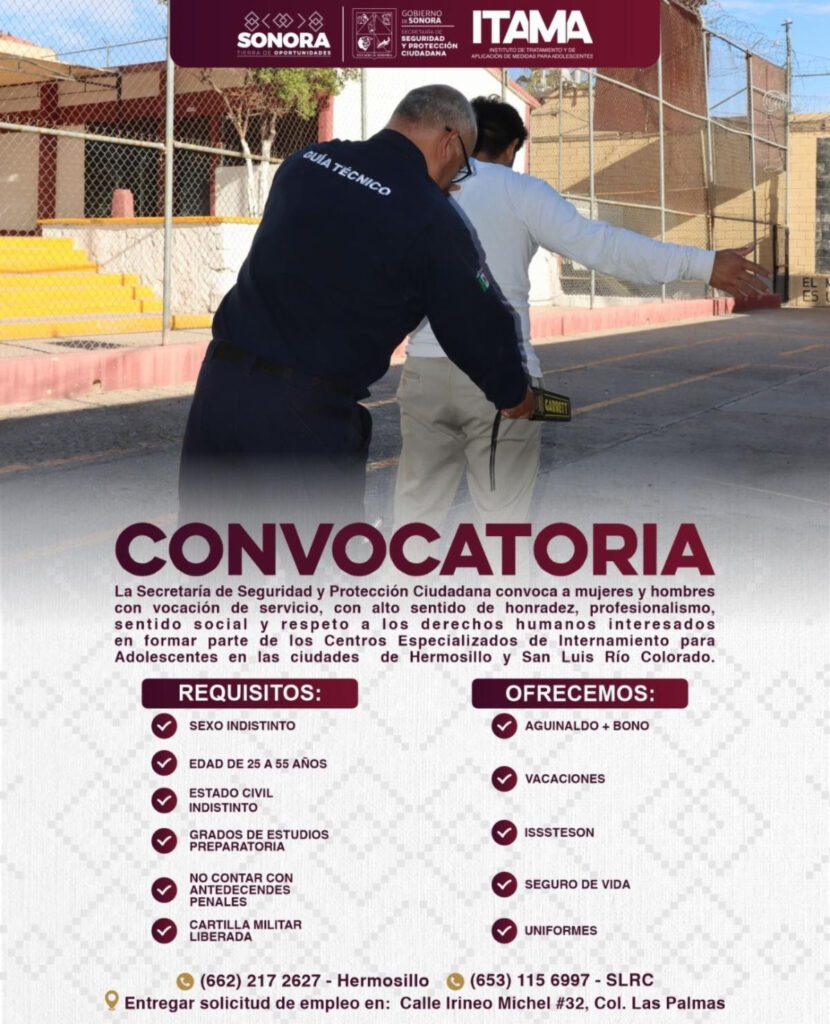 Para reforzar las labores de seguridad al interior de los Centros Especializados de Internamiento en Hermosillo y San Luis Río Colorado, el Instituto de Tratamiento y de Aplicación de Medidas para Adolescentes (ITAMA) anunció su convocatoria para Guías Técnicos.