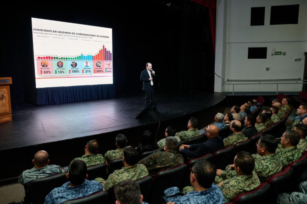 Durante su exposición, el mandatario sonorense, acompañado de José Ernesto San Román Águila, director del Colegio de Defensa Nacional; José Manuel Guevara Castillo, comandante de la Cuarta Zona Militar, subrayó que el Plan Sonora representa una estrategia integral de Estado que articula crecimiento económico, transición energética y estabilidad social, elementos indispensables para la seguridad nacional y el bienestar regional.