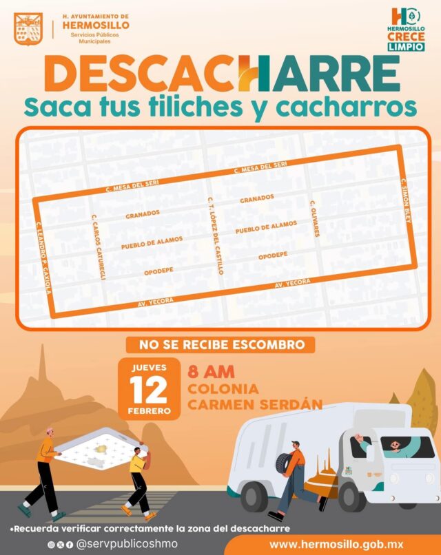 Vecinas y vecinos de la colonia Carmen Serdán y alrededores podrán aprovechar este jueves 12 de febrero la jornada de descacharre que llevará el Ayuntamiento de Hermosillo a partir de las 8:00 horas.