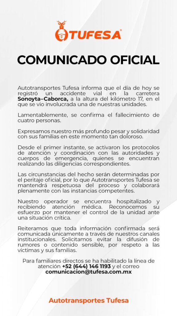 La empresa transportista informó mediante un posicionamiento oficial que una de sus unidades estuvo involucrada en el siniestro y confirmó los decesos. Indicó además que se activaron de inmediato los protocolos de coordinación con autoridades y servicios de emergencia, mientras que el operador del autobús permanece hospitalizado y bajo atención médica.