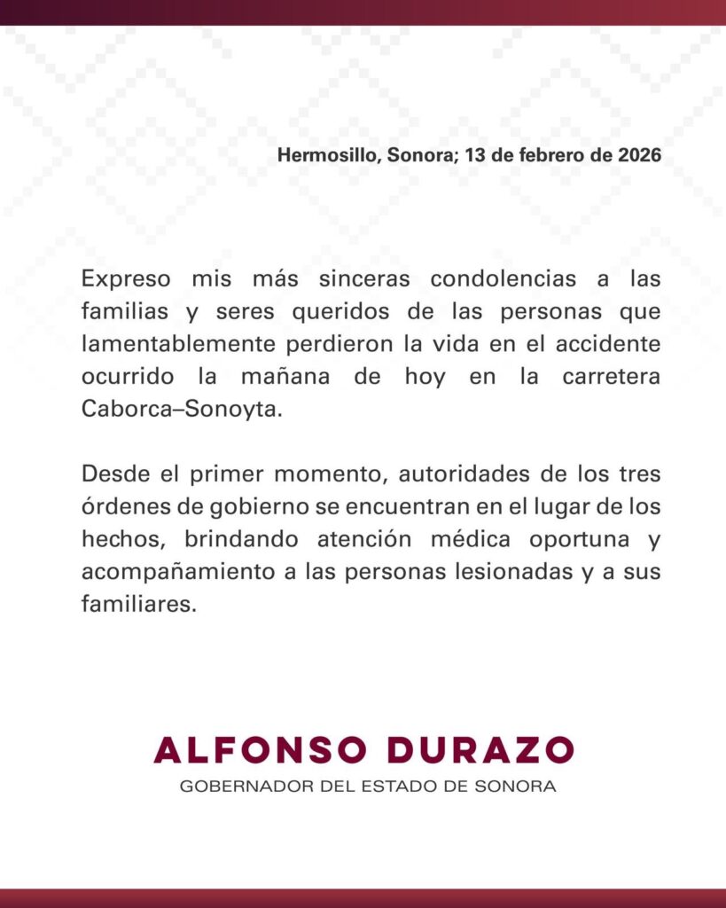 Por su parte, el gobernador Alfonso Durazo Montaño expresó condolencias a los familiares de las víctimas e informó que dependencias de los tres niveles de gobierno brindan atención médica, acompañamiento y asistencia a las personas lesionadas.