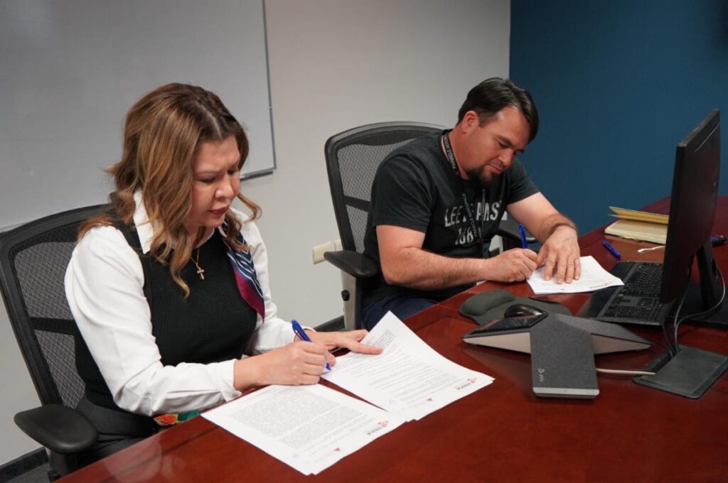 La directora general del Itesca, Margarita Vélez de la Rocha, firmó un convenio de colaboración con Yolanda María Félix García y Edson Orozco Armenta, directora de Finanzas y director de Recursos Humanos, respectivamente, de Pinnacle Software Engineering, empresa dedicada al desarrollo de software.