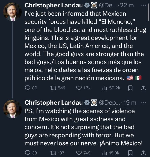 En un mensaje posterior, Landau también expresó tristeza y preocupación por las escenas de violencia difundidas desde México, señalando que la reacción violenta de grupos criminales no resulta inesperada y llamó a mantener la calma.
