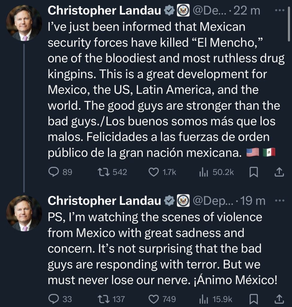 El subsecretario de Estado de Estados Unidos, Christopher Landau, se pronunció en redes sociales luego de que circularan versiones sobre el presunto abatimiento de Nemesio Oseguera Cervantes, alias “El Mencho”, identificado como líder del Cártel Jalisco Nueva Generación (CJNG).