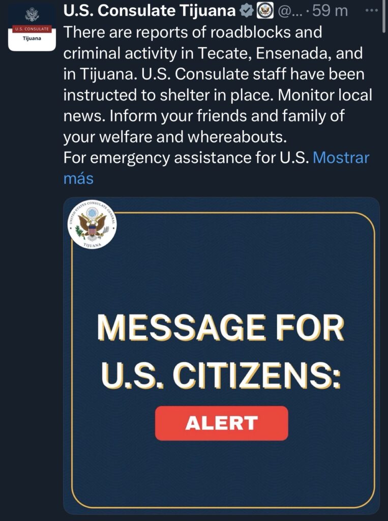 El Consulado de Estados Unidos en Tijuana emitió un aviso dirigido a sus ciudadanos ante reportes de bloqueos carreteros y actividad criminal en distintos puntos de Baja California.