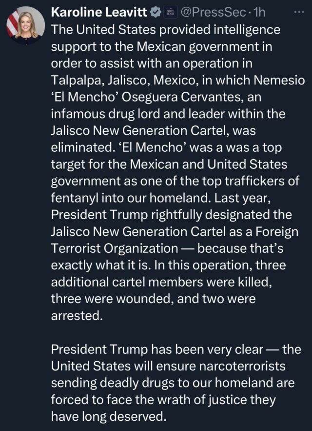 La secretaria de prensa de la Casa Blanca, Karoline Leavitt, informó a través de un mensaje publicado en la red social X que el gobierno de Estados Unidos proporcionó apoyo de inteligencia al gobierno mexicano para la realización de un operativo en Talpalpa, Jalisco.