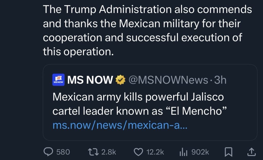 De acuerdo con la funcionaria estadounidense, la asistencia tuvo como objetivo facilitar la operación en la que fue abatido Nemesio Oseguera Cervantes, alias “El Mencho”, identificado por autoridades de ambos países como uno de los principales responsables del tráfico de fentanilo hacia territorio estadounidense.