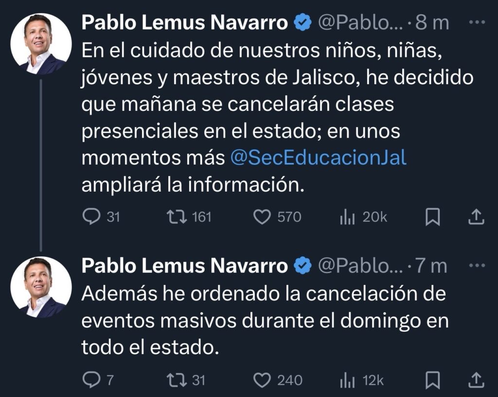 El Gobierno de Jalisco anunció la suspensión de clases presenciales en todo el estado, luego de los hechos de seguridad reportados en las últimas horas.