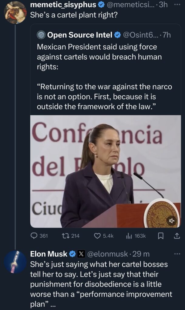 Tras ese contenido, Musk escribió que la presidenta “solo dice lo que sus jefes del cartel le dicen que diga” y añadió que el castigo por desobedecer sería más severo que un simple “plan de mejora de desempeño”, comentario que generó amplia reacción entre usuarios de la plataforma.