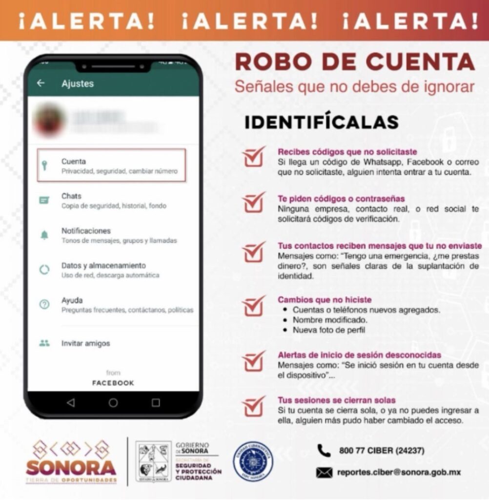 La Secretaría de Seguridad y Protección Ciudadana (SSPC) Sonora, a través de la Unidad Cibernética, reitera el llamado sobre el riesgo de robo y suplantación de cuentas en redes sociales y aplicaciones de mensajería instantánea, una modalidad de fraude digital que puede comprometer la información personal y afectar el patrimonio de las familias.