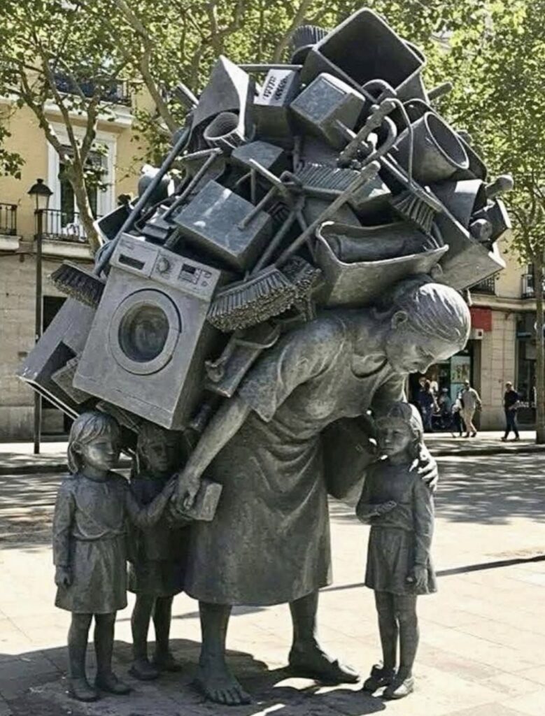 Una escultura ubicada en Barcelona, España, se ha vuelto viral en redes sociales tras la difusión de una fotografía que muestra a una mujer caminando con dos niños mientras soporta sobre la espalda una enorme pila de objetos domésticos: lavadora, utensilios, cubetas y aparatos del hogar.