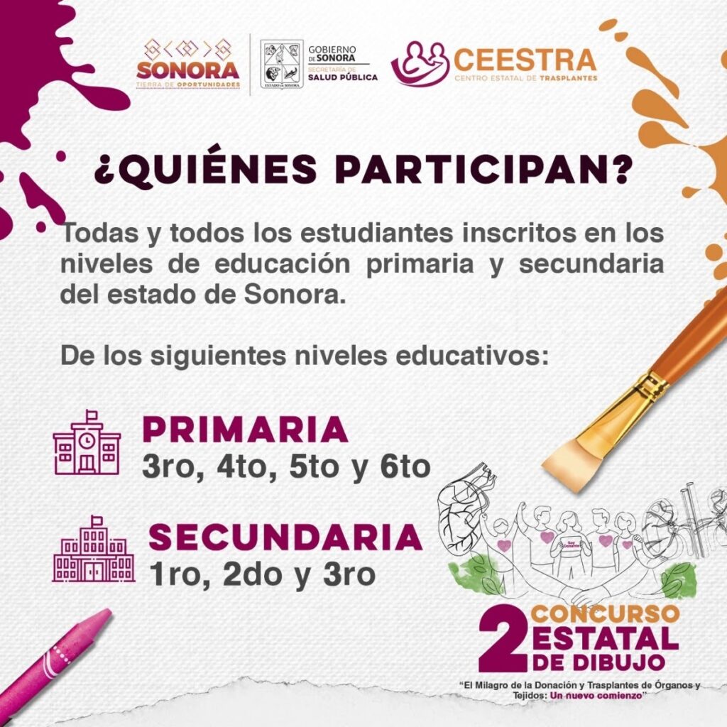 El Gobierno de Sonora, a través de la Secretaría de Salud Pública (SSP) y del Centro Estatal de Trasplantes (Ceestra), informa que hoy es el último día para participar en el Segundo Concurso Estatal de Dibujo “El Milagro de la Donación y Trasplantes de Órganos y Tejidos: Un Nuevo Comienzo”. La convocatoria cerrará de manera definitiva a las 15:00 horas de este 27 de febrero.