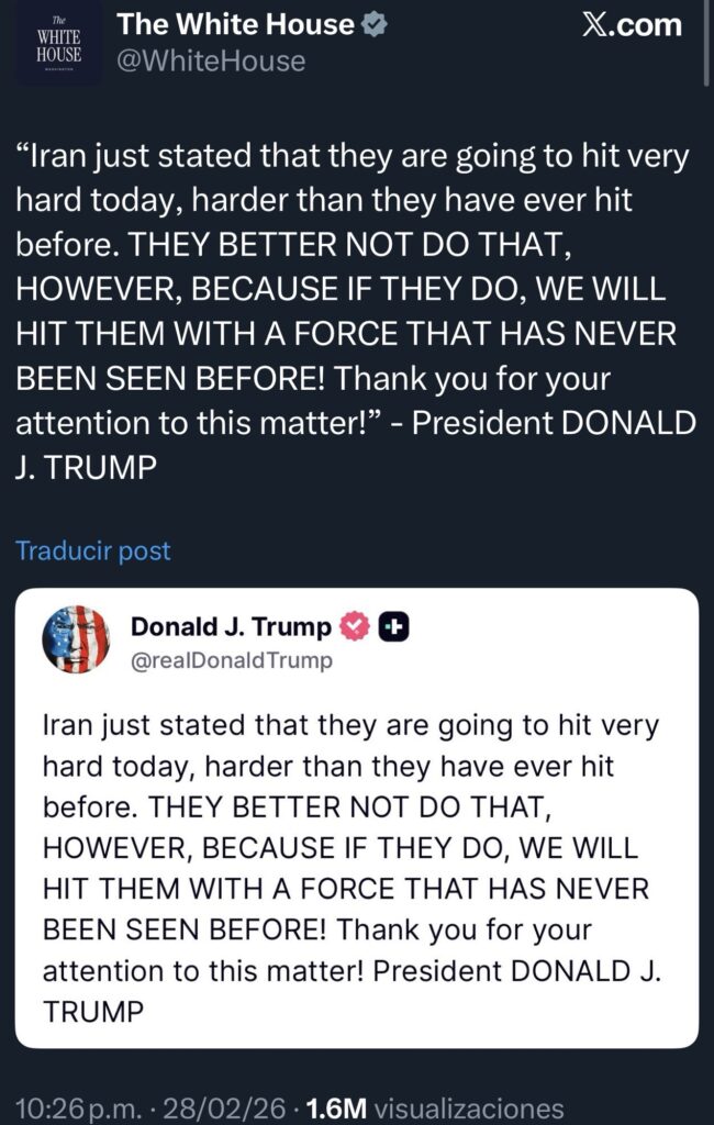 A través de un mensaje difundido en redes sociales y replicado por la Casa Blanca, el mandatario afirmó que Irán anunció que “golpeará muy fuerte”, incluso más que en ocasiones anteriores. En respuesta, Trump lanzó una advertencia directa señalando que, de concretarse dicha acción, Estados Unidos respondería con una fuerza “que nunca se ha visto antes”.