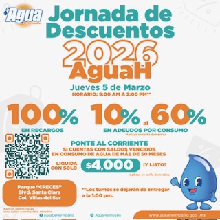 Este jueves 5 de marzo de 9:00 a 14:00 horas se llevará a cabo la Jornada de Descuentos que impulsa Agua de Hermosillo en las instalaciones del Parque “CRECES”, ubicado en bulevar Santa Clara, en la colonia Villas del Mar, para la ciudadanía que desee ponerse al corriente en sus pagos.