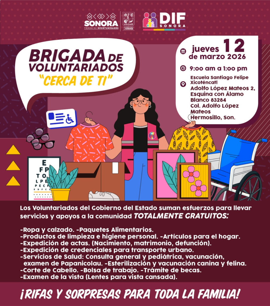 El Gobierno de Sonora, a través del Sistema DIF Sonora, invita a las familias de Hermosillo a participar en la Brigada de Voluntariados “Cerca de Ti”, una jornada de servicios y apoyos totalmente gratuitos que se realizará en la Escuela Santiago Felipe Xicoténcatl, ubicada en la colonia Adolfo López Mateos.