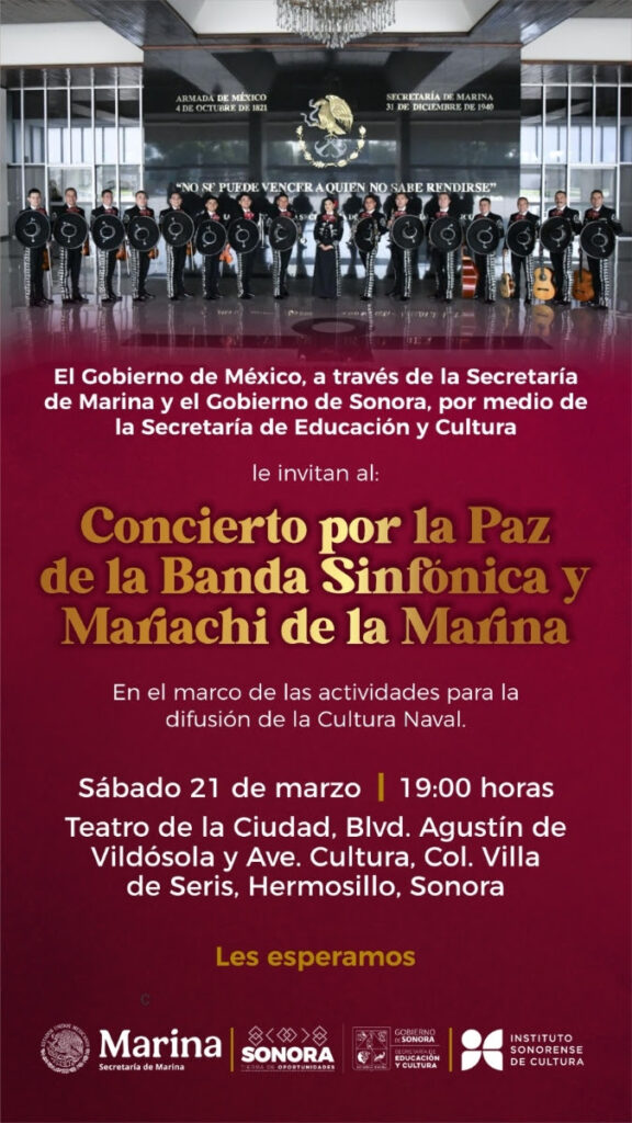 Hermosillo y Guaymas serán sedes de los “Conciertos por la Paz”, un evento creado para fortalecer la identidad nacional y la cultura naval, así como la promoción de los valores patrios a través de la disciplina y el talento de los músicos que integran la Banda Sinfónica y Mariachi de la Secretaría de Marina Armada de México (SEMAR).