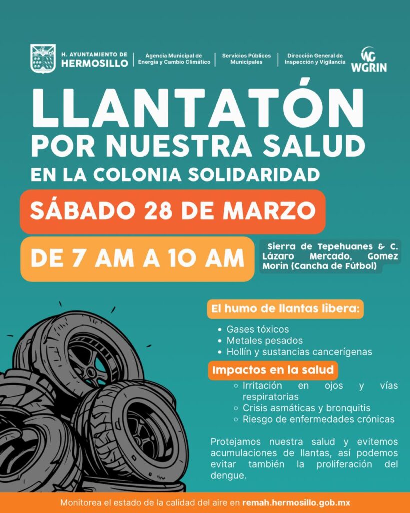 Una nueva edición del “Llantatón por nuestra salud” organizado por el Ayuntamiento de Hermosillo a través de la Agencia Municipal de Energía y Cambio Climático, AMECC, se realizará este sábado 28 de marzo en la colonia Solidaridad.