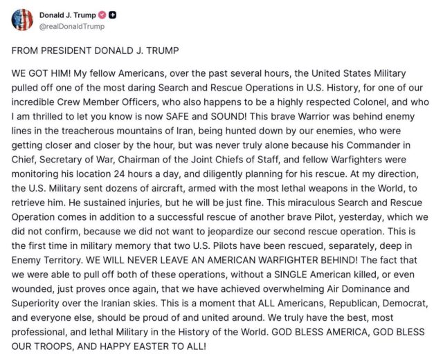 De acuerdo con el mensaje difundido, el militar —descrito como un coronel altamente respetado— se encontraba en una zona montañosa en Irán, donde era perseguido por fuerzas enemigas. Trump aseguró que el oficial fue localizado y recuperado tras una operación de búsqueda y rescate ejecutada por el ejército estadounidense.