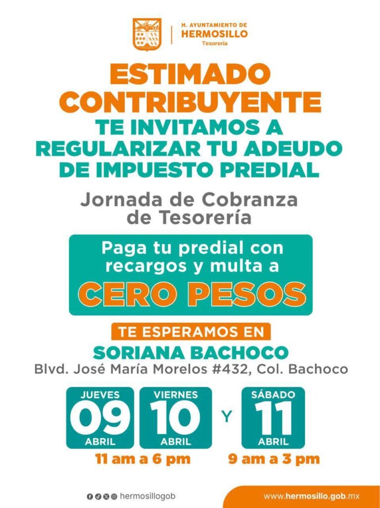 Este jueves 9, viernes 10 y sábado 11 de abril llegará Tesorería Municipal con el Programa de Regularización de Predial a centro comercial Soriana Bachoco ubicado en bulevar José María Morelos número 432, con grandes beneficios en predial como cero pesos en recargos y multa.