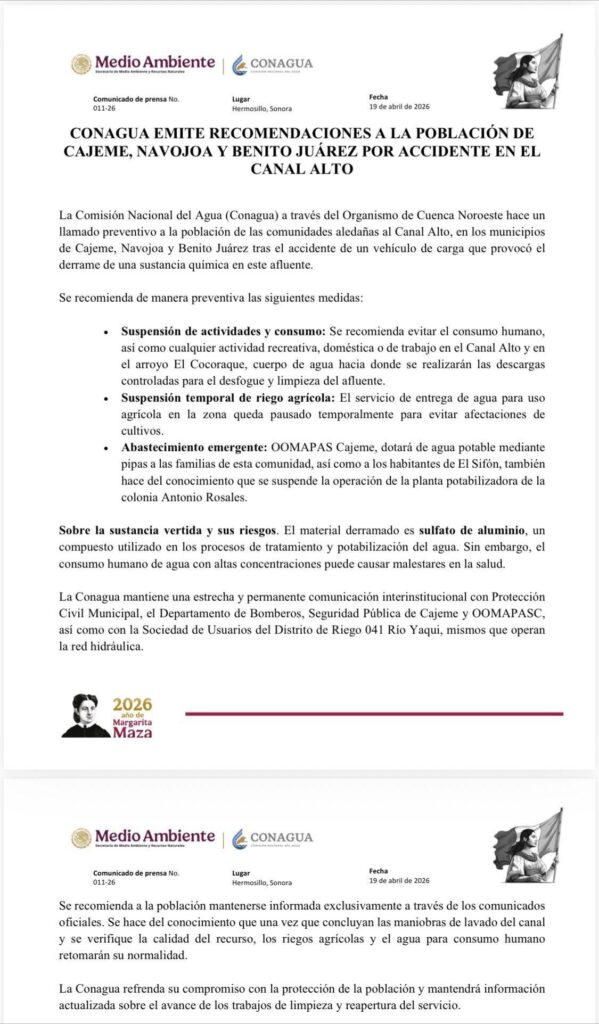 La Comisión Nacional del Agua (Conagua) emitió un llamado preventivo dirigido a la población de los municipios de Cajeme, Navojoa y Benito Juárez, tras registrarse un accidente en el Canal Alto que derivó en el derrame de una sustancia química.