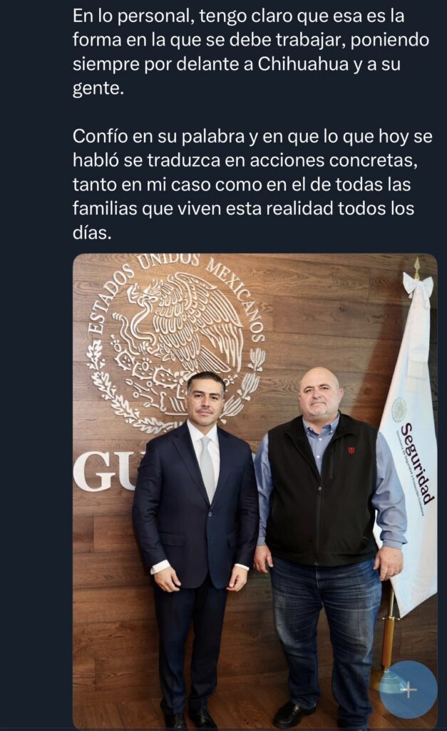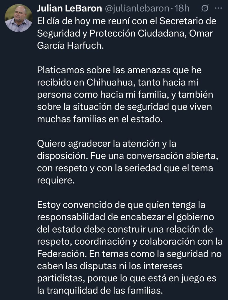 LeBarón expresó su confianza en que los planteamientos realizados durante la reunión se traduzcan en acciones concretas que beneficien no solo su caso, sino el de todas las familias que enfrentan condiciones de violencia en Chihuahua.