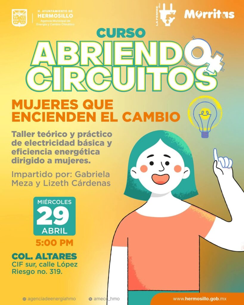 Con el objetivo de impulsar la participación de las mujeres en oficios que tradicionalmente se han masculinizado y fortalecer su autonomía en el hogar y la vida laboral, el Ayuntamiento de Hermosillo y la Agencia Municipal de Energía y Cambio Climático invita a participar en el taller “Abriendo Circuitos”, que se llevará a cabo el miércoles 29 de abril a las 17:00 horas en el CIF Sur de la colonia Altares, ubicado en calle López Riesgo #319.