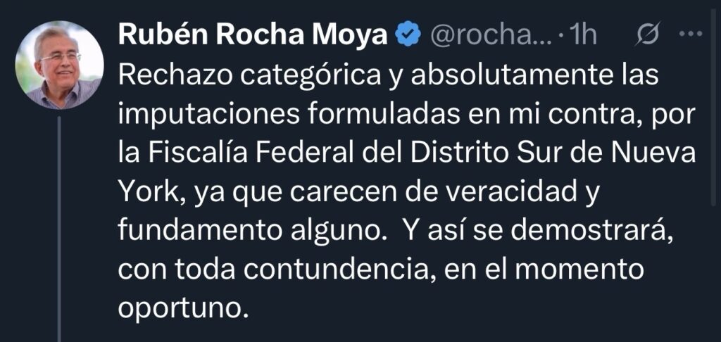 Culiacán, Sinaloa. El gobernador de Sinaloa, Rubén Rocha Moya, rechazó de manera categórica las imputaciones formuladas en su contra por la Fiscalía Federal del Distrito Sur de Nueva York, asegurando que carecen de veracidad y fundamento.