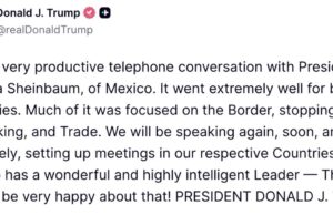 El expresidente de Estados Unidos, Donald J. Trump, informó que sostuvo una conversación telefónica “muy productiva” con la presidenta de México, Claudia Sheinbaum, la...
