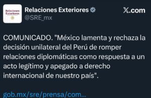 La Secretaría de Relaciones Exteriores (SRE) emitió este domingo un comunicado en el que lamenta y rechaza la decisión unilateral del Gobierno de Perú...