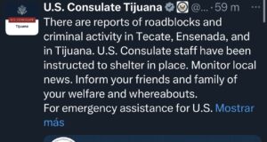 Consulado de EE.UU. en Tijuana emite alerta por reportes de bloqueos...