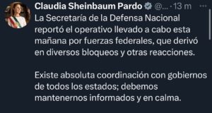 Sheinbaum llama a mantener la calma tras operativo federal y bloqueos