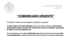 ALERTA A LA CIUDADANÍA: Club Yaquis desmiente concierto de Carín León...